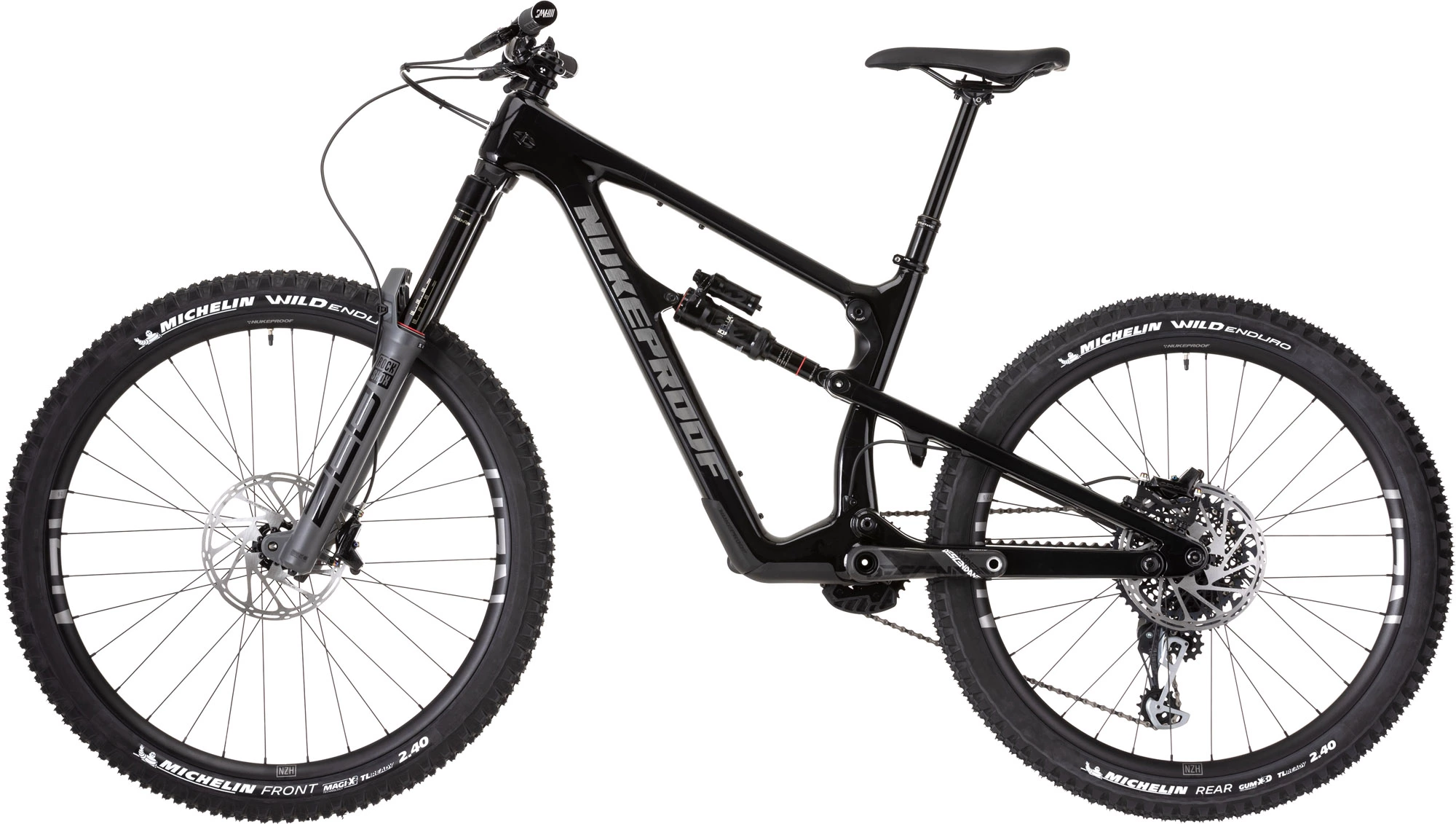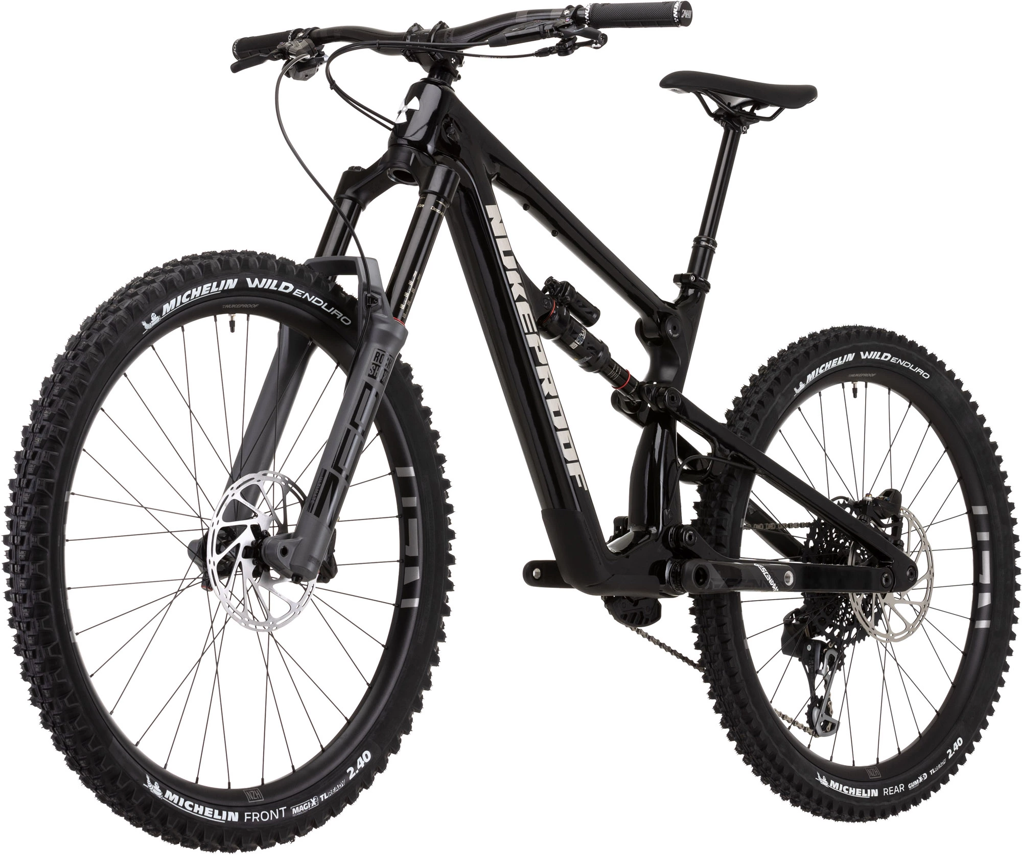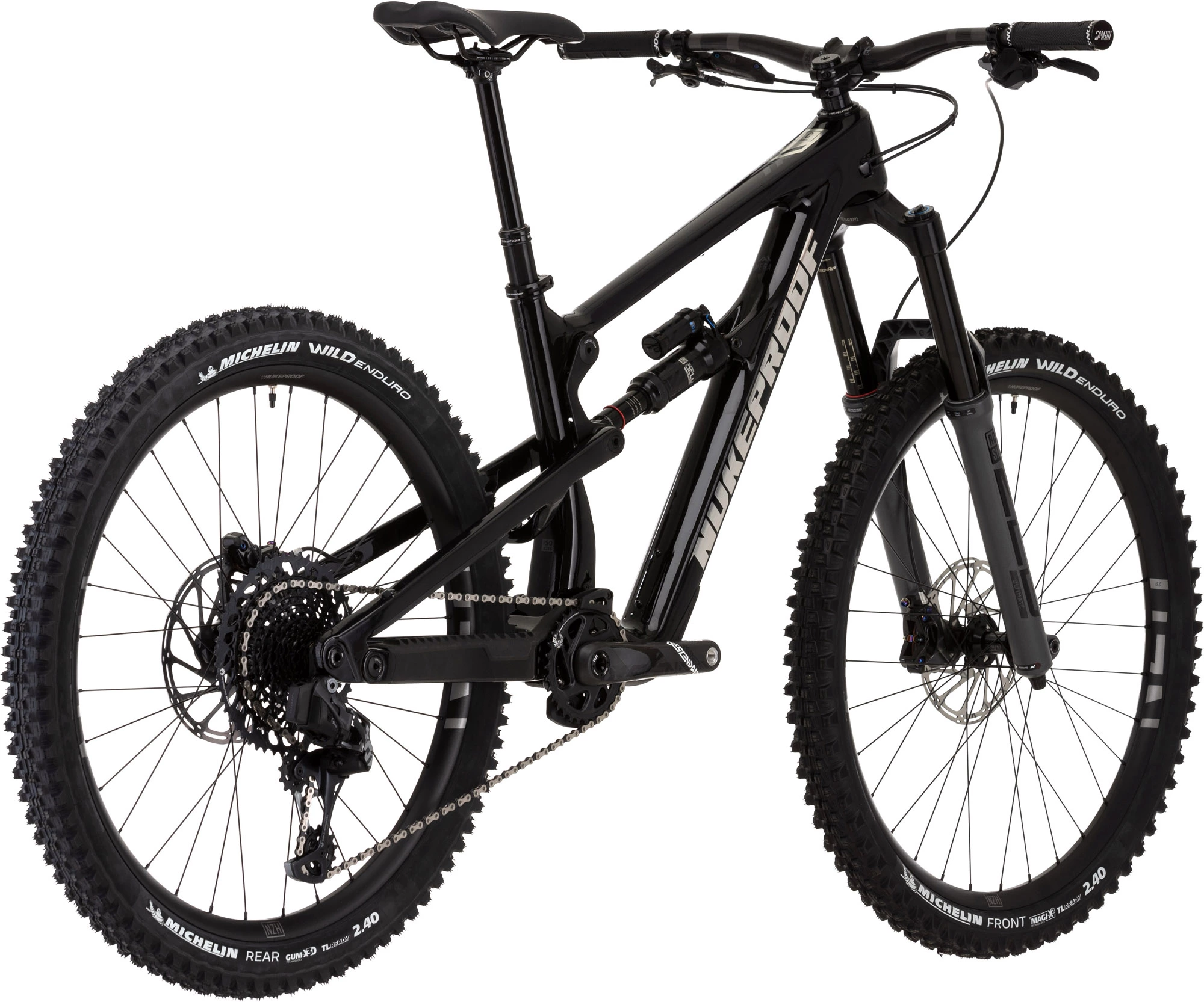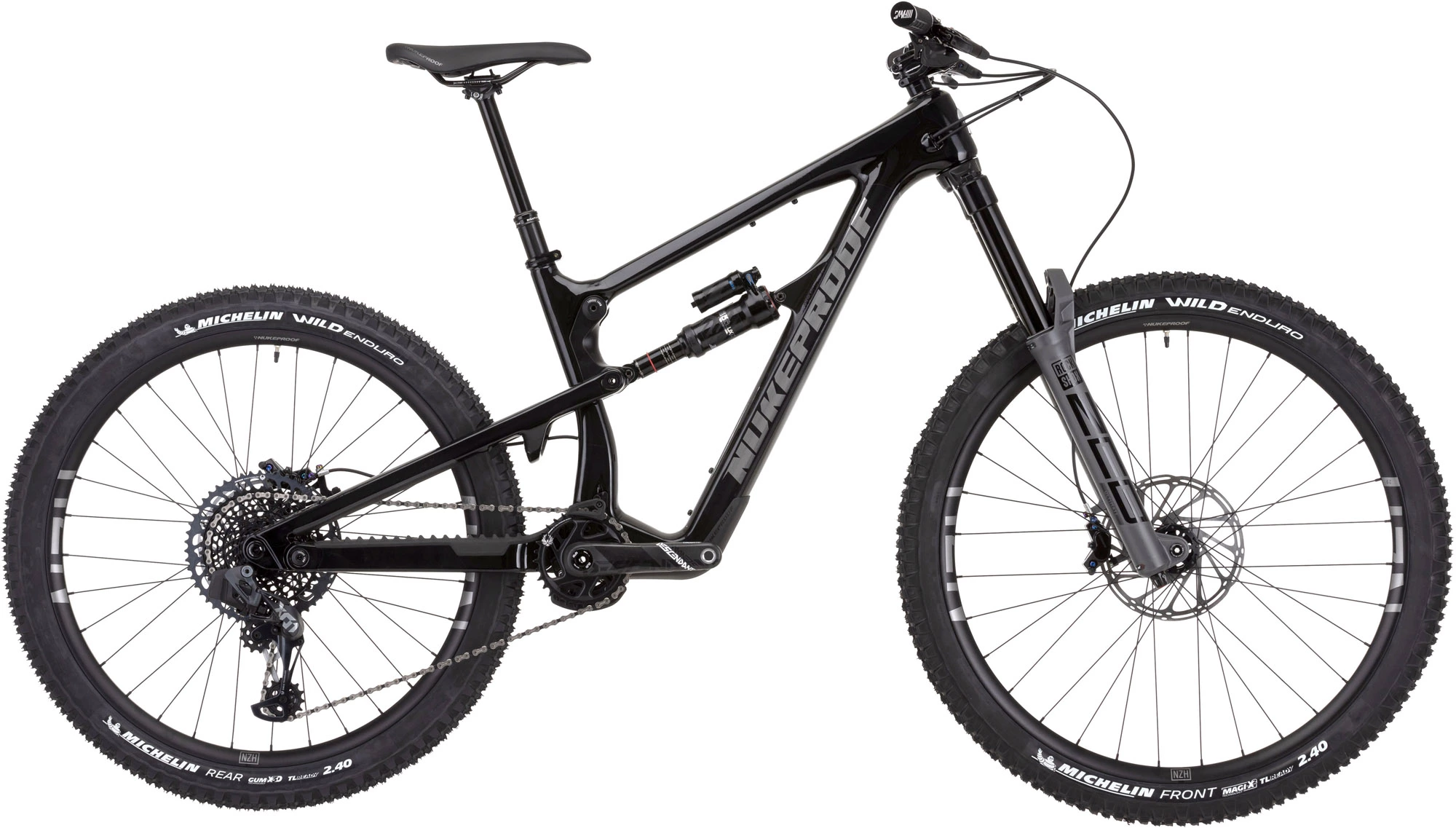This exceptional race bike is kitted out with SRAM’s top-level XO1 Eagle 12-Speed groupset with strong, lightweight and stylish SRAM Descendant Carbon cranks, a wide-ranging 10-52 Tooth cassette and powerful SRAM Code RSC hydraulic disc brakes. It also rolls upon Tubeless Ready Nukeproof Horizon V2 wheels wrapped in fast-rolling, high-grip GUM-X Tubeless Michelin Wild Enduro tyres. And it is armed with a quality Nukeproof Horizon finishing kit that includes Nukeproof Horizon Carbon handlebars and a Bikeyoke Revive Stealth dropper seatpost.