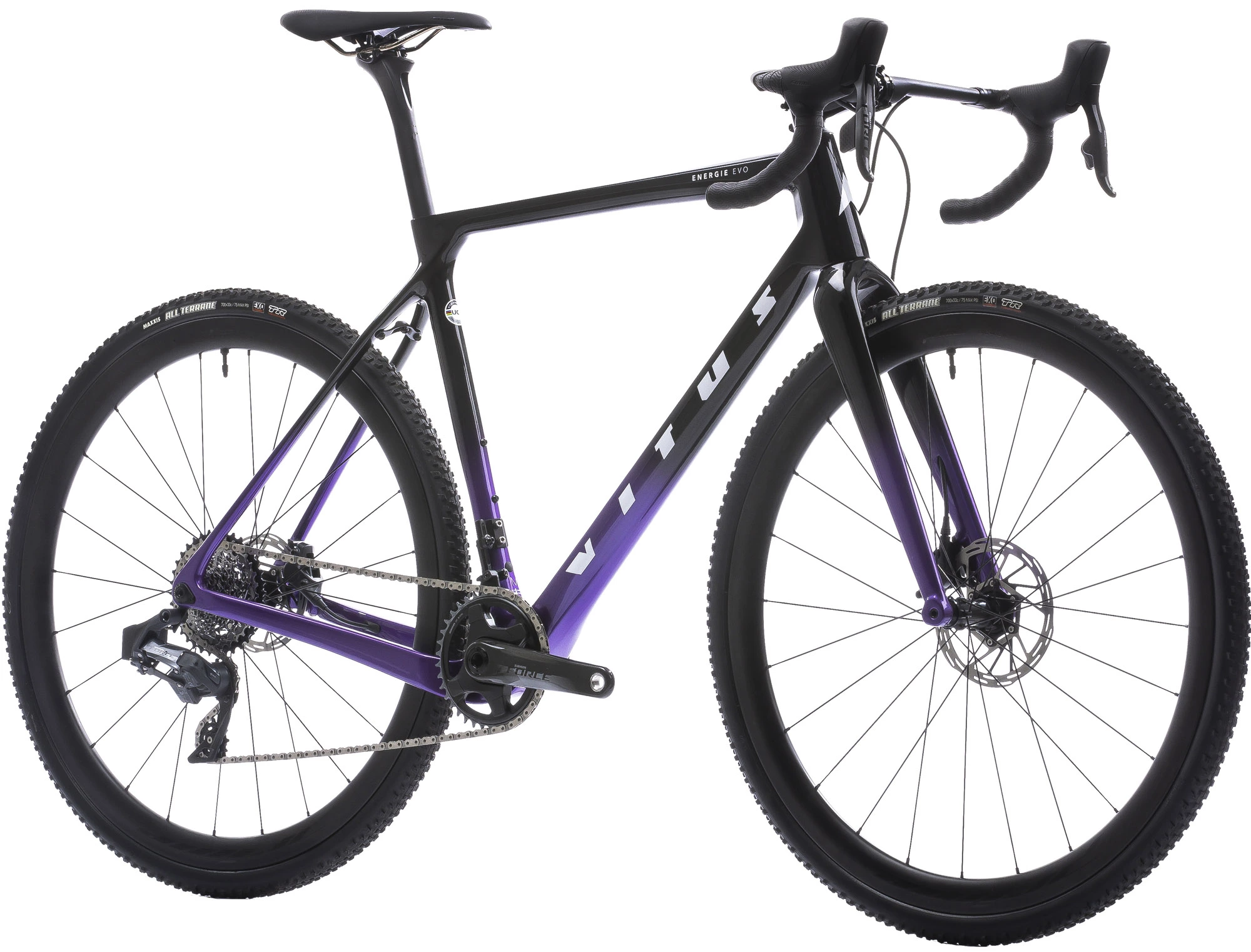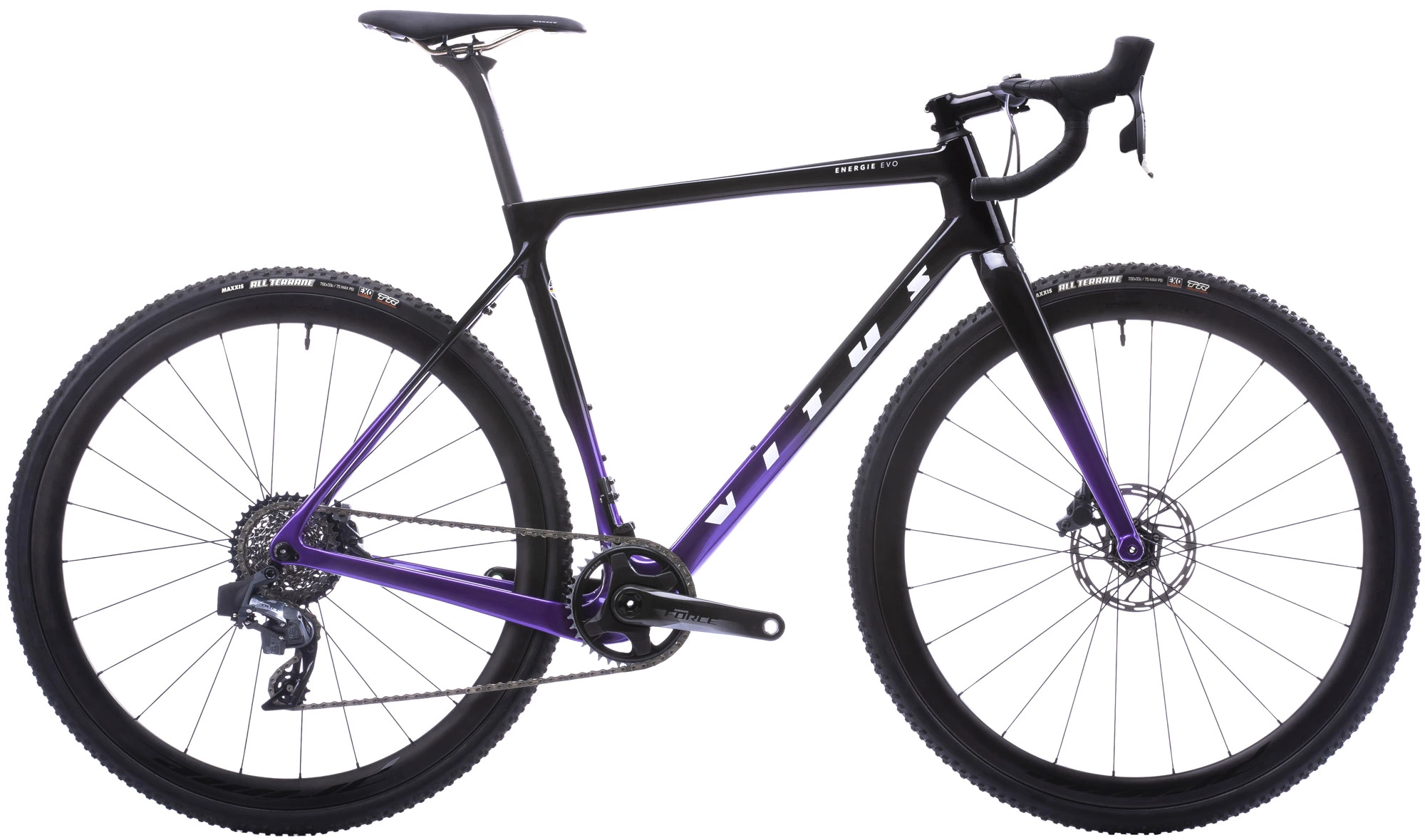 Das Vitus Energie EVO CRS eTap FORce verfügt über eine SRAM Force eTap AXS 12-Gang-Gruppe mit Drahtlos-Technologie für schnelle und präzise Gangwechsel und ist mit einer 40-Zahn-Kurbelgarnitur, einer 10-36-Zahn-Kassette und hydraulischen Scheibenbremsen ausgestattet – damit haben Sie einen breiten Gangbereich und kraftvolles Bremsen für alle Bedingungen. Außerdem rollt es auf schlauchlosen Prime BlackEdition-Carbonrädern, die mit schlauchlosen Maxxis All Terrane-Reifen ausgestattet sind.