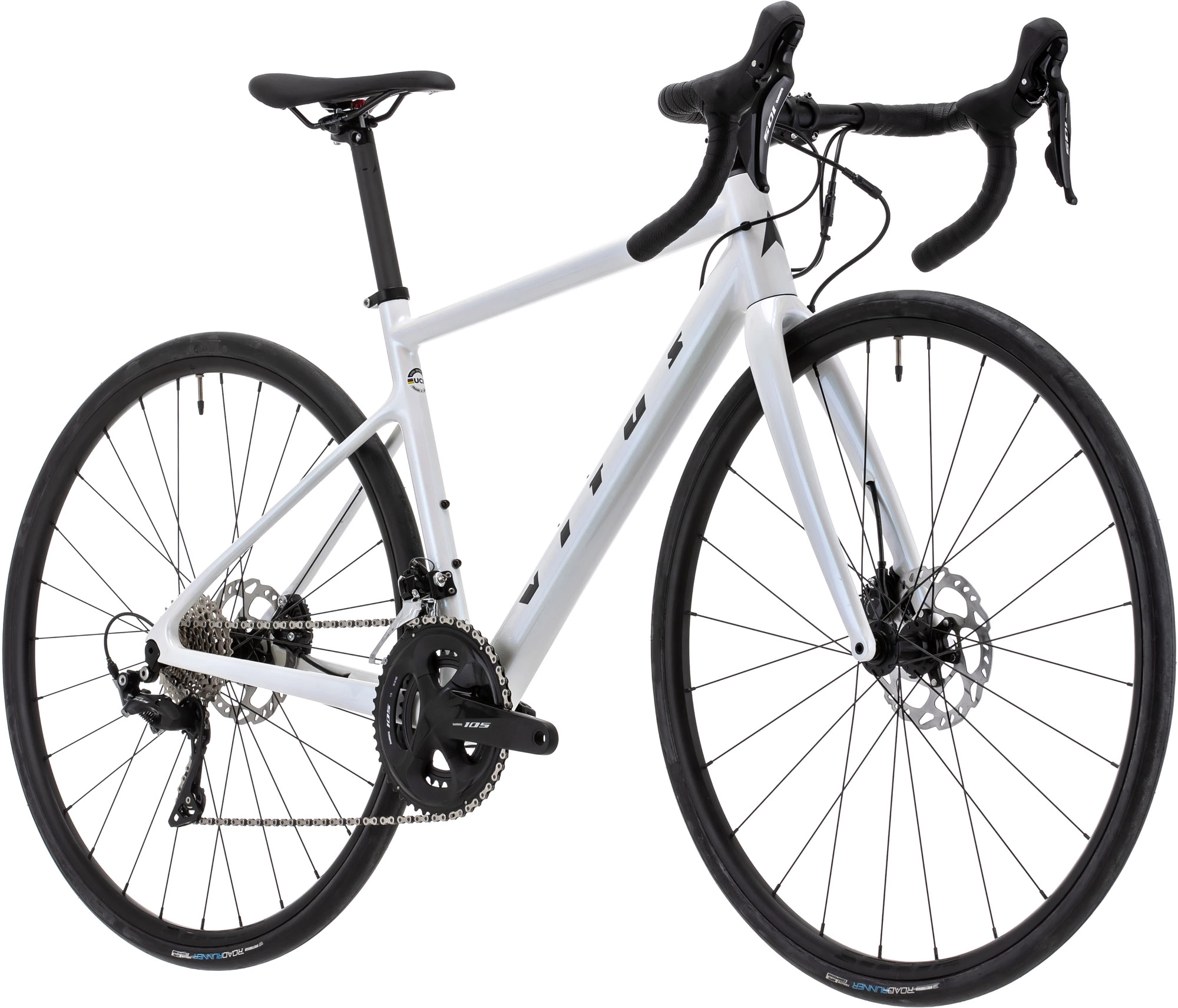 Das Zenium CRW verfügt über einen Carbonrahmen, eine Carbongabel und rollt auf Prime Shining-Felgen, die mit griffigen Kenda Kwick Roller Sport-Reifen umwickelt sind. Vitus hat dieses Rennrad mit einer Shimano 105 R7000 2×11-fach-Gruppe und leistungsstarken hydraulischen Shimano 105-Scheibenbremsen ausgestattet, um Ihnen eine große Gangbandbreite zu bieten, mit der Sie steile und schnelle Abfahrten sicher bewältigen können.