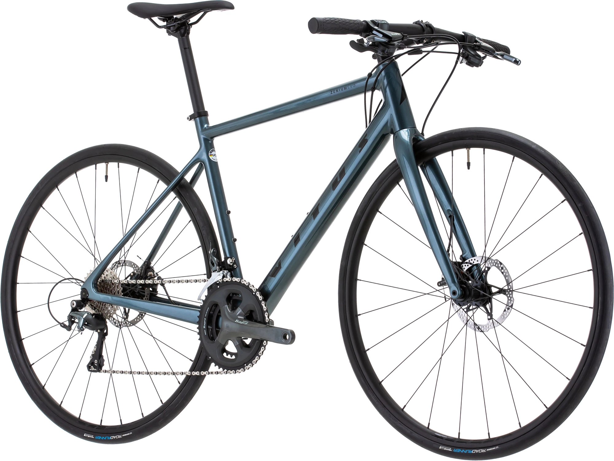 Das Zenium verfügt über ein Carbon-Rahmenset ausgestattet und ist mit einem flachen Lenker und einer Shimano Tiagra 2×10-fach Gruppe mit mechanischen Scheibenbremsen ausgestattet. Der zusätzliche flache Lenker bietet eine entspannte, aufrechte Sitzposition, die ideal für Fitnessradfahren, gemütliche Sport- und Wohltätigkeitsveranstaltungen sowie lange Ausdauereinheiten ist. Es rollt auch schnell und stabil auf Vitus Shining-Felgen, die mit griffigen Kenda Kwick Roller Sport-Reifen umwickelt sind.