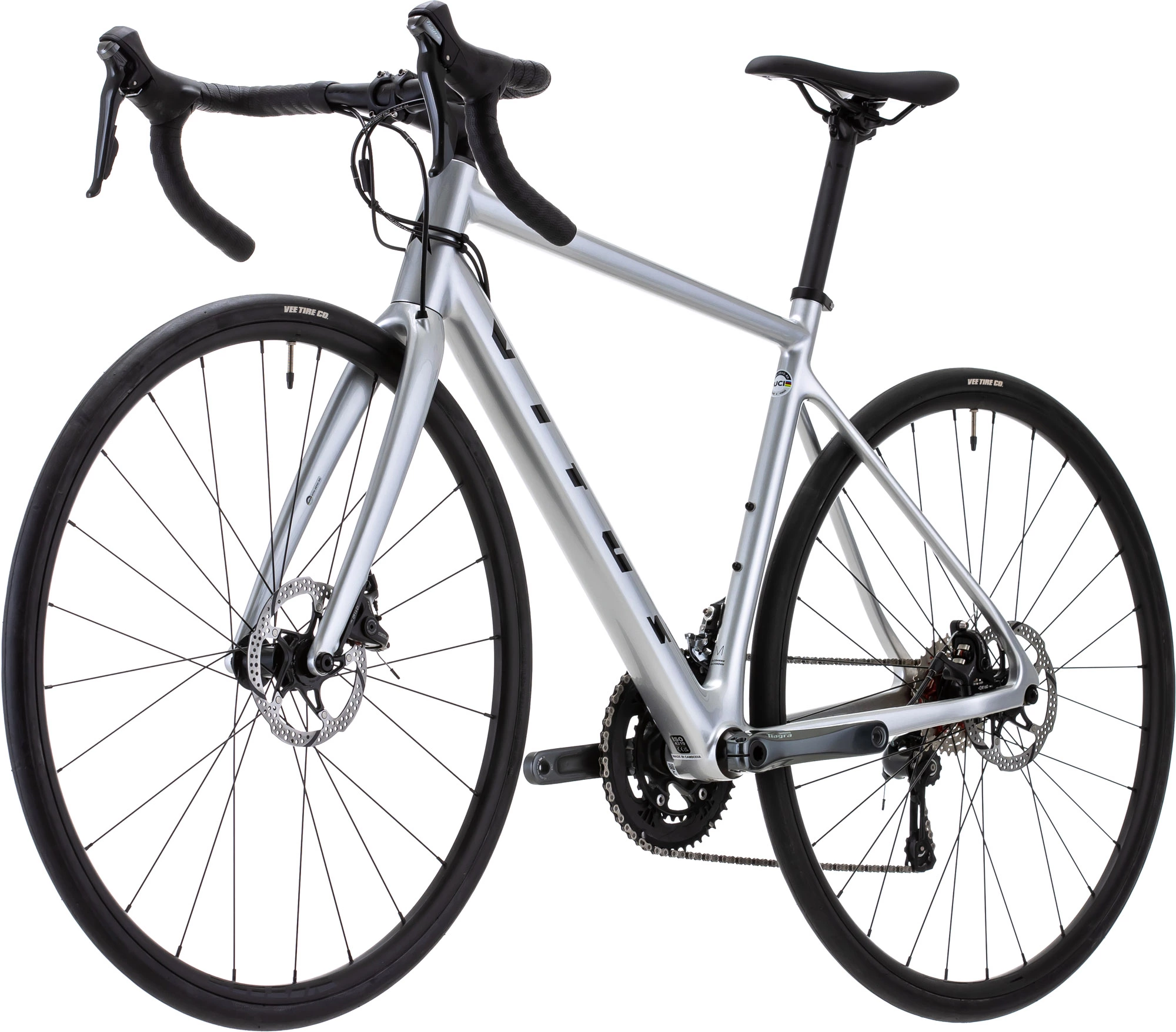 Es verfügt über einen Carbonrahmen und eine Gabel sowie eine Shimano Tiagra 2×10-fach-Gruppe mit einer 11-32-Zähne-Kassette und mechanischen TRP Spyre-Scheibenbremsen. Es rollt auch schnell und stabil auf Vitus Shining-Felgen, die mit griffigen und äußerst verlässlichen Kenda Kwick Roller Sport-Reifen umwickelt sind. Dieses Fahrrad bietet Ihnen eine hervorragende Balance aus Zuverlässigkeit und Komfort bei geringem Gewicht, kombiniert mit hervorragender Effizienz beim Fahren bergauf und Allwetter-Bremskraft.